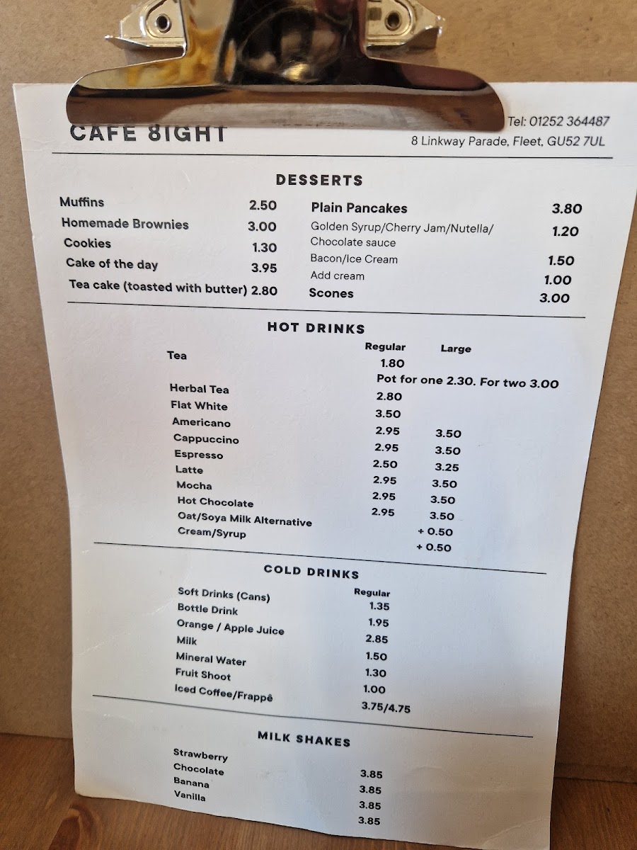 Nestled at 8 Linkway in Fleet, Café 8ight presents a menu that balances comfort and taste. The café specializes in a variety of delectable burgers, with options ranging from a simple Plain Burger (£3.80) to the hearty Cheese, Egg & Bacon choice (£5.00). Vegetarians are also catered to with the Veggie or Vegan burger at £4.50.